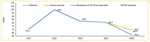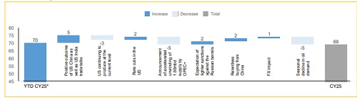 We maintain our estimate for Brent at US$69.0/b for the Calendar Year 2025 (as published on June 13, 2025) compared to YTD average of US$69.6/b..