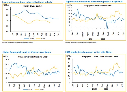 * Disruptions at Russian refinery facilities have tightened the supply of middle-distillate fuels, lifting Asian crack spreads higher and strengthening refining margins. This has bolstered profitability for India’s pure-play refiners amid ongoing supply-side stress.