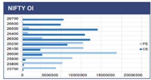 Nifty ended the week marginally lower near 26,200, showing signs of consolidation after the recent up-move. The index continues to trade above the rising trendline and key short-term averages, keeping the broader trend positive. Immediate resistance is placed at 26,350–26,450, while support lies at 25,850–25,900. RSI is steady near 60, indicating neutral-to-positive momentum. A decisive breakout above 26,450 could trigger fresh upside, while a break below 25,850 may invite short-term profit booking.