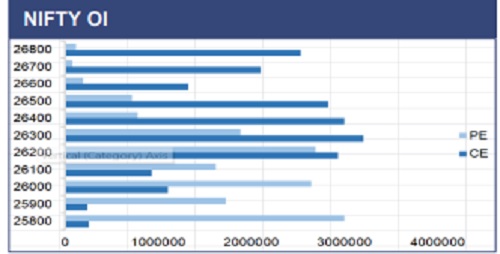 Nifty continues to trade near the record zone around 26,200– 26,300, indicating strong underlying momentum despite minor intraday volatility. The index is holding above its rising trendline and key short-term averages, keeping the overall structure bullish. Immediate support is seen around 25,950–26,000, while a decisive breakout above 26,350 can trigger a fresh leg of up-move towards 26,600–26,800. RSI is near 60, suggesting healthy momentum without being overbought. Overall bias remains positive, with dips likely to attract buying interest.
