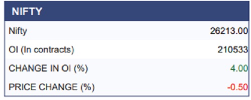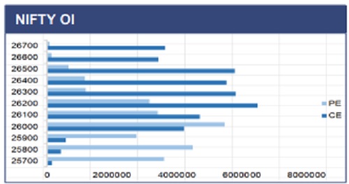 Nifty ended at 26,032, slipping from the 26,200–26,260 resistance zone due to profit booking at higher levels. The index has dipped slightly below the short-term rising trendline, indicating near-term consolidation. RSI near 55 signals cooling momentum but no major weakness yet. Immediate support lies at 25,950–25,900; below this, 25,800 is key. For fresh upside, Nifty must reclaim 26,150–26,200. Overall positional trend stays positive with short-term caution.