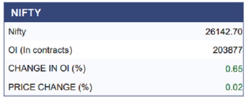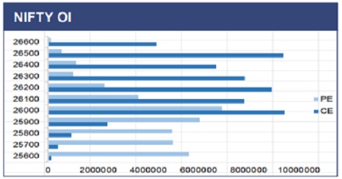 Nifty continues to trade in a consolidation phase after failing to sustain above the recent highs near 26,250. The index is currently hovering around the 20-day moving average, indicating a wait-andwatch phase for fresh direction. RSI remains near the neutral zone, suggesting muted momentum in the near term. A sustained move above 26,250 can revive bullish momentum towards 26,500– 26,700. On the downside, 25,750–25,700 is a crucial support zone to watch for trend stability.