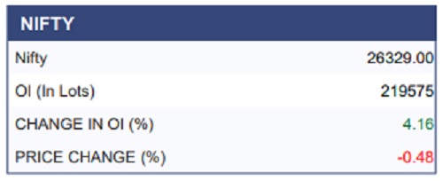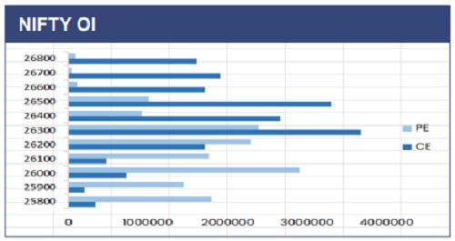 The Nifty 50 opened on a strong note and inched towards fresh record highs but failed to sustain near the top. Profit booking near the 26,400 level dragged the index to an intraday low of 26,210 before it settled at 26,250. On the daily chart, the index remains resilient above the 26,200 mark, which keeps the bullish bias intact. A decisive break down below this level could extend the corrective fall towards 26,000. In the derivatives segment, fresh call writing at 26,300 and 26,400 indicates immediate resistance, while substantial put OI at 26,000 offers downside support.