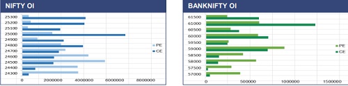 Nifty started the session on the positive note and traded within the narrow range during the first half. However, a decisive breakout in the second half triggered a recovery towards the 24,850 level before settling the day at 24,765, with gains of more than one percent. On the derivatives front, fresh put writing was observed at the 24,500 and 24,600 strikes, which had witnessed call writing in the previous session, indicating this zone as a tug-of-war area between bulls and bears. Sustaining above this zone signals an improvement in market sentiment and pave the way towards the 25,000 mark, which remains a significant resistance due to the major Call OI buildup.