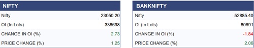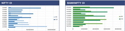 The Nifty index began the week on a positive note, gaining over one percent with settling near the 23,000 mark. From a technical standpoint, a decisive move above 23,000 could extend the uptrend towards 23,200, while the 23,500 level remains a critical resistance on the upside. On the derivatives front, fresh put writing was observed at the 22,500 strike for the upcoming weekly expiry, indicating an immediate support zone. Meanwhile, notable call writing at the 23,200 strike suggests an immediate overhead resistance, which may cap the further upside move.