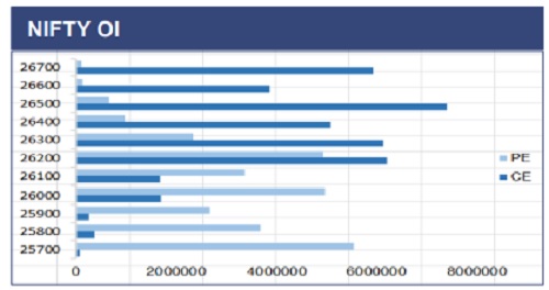 The Nifty 50 ended the session at 26,178, registering a lacklustre and range-bound performance on the first weekly expiry of the January series. On the upside, profit taking was observed near the 26,300 level, while on the downside, the index found support and rebounded from the 26,100 mark. In the derivatives segment for the upcoming weekly expiry, fresh Call OI buildup at the 26,200 strike indicates that sustaining below this level may continue to cap the upside. On the downside, significant Put OI at the 26,000 strike provides immediate support, while a decisive break below this level could shift focus towards the 25,700 zone, which has previously acted as a strong base.