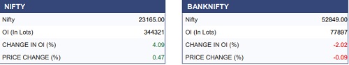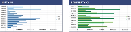 The Indian benchmark indices extended their gains for the second consecutive session, with the Nifty index decisively settled above the 23,000 mark. From a technical standpoint, the next crucial hurdle is placed around the 23,500 zone, which coincides with the short-term 20-DEMA. A sustained move beyond this zone could further improve near-term sentiment and open the door for additional upside. On the derivatives front, fresh call writing at 23,500 and put writing at 22,500 suggest a likely consolidation range in the near term, with 23,000 emerging as a key contention zone. The next directional move is driven by a decisive breakout on the either side on this range.