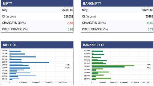 The Nifty index began the session with a gap-up opening. However, the rest of the day remained sideways, with the index traded within the narrow range of 100-points. On the derivatives front, fresh put writing was observed at the 25,800 strike, indicating an immediate support level and sustaining above this zone could propel the index towards the 26,000 mark, where the significant call OI has placed. On the daily chart, the index continues to trade above the 20-DEMA, keeping the bullish bias intact for the near term and buy the dip approach remains prudent.