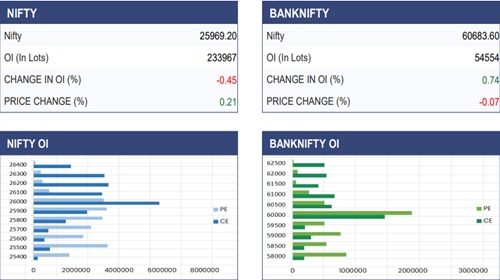 The Nifty index continues to remain in a consolidation phase, reflects the indecision near higher levels, however the bullish bias remains intact above the 20-DEMA zone. The index is currently trading around the 26,000 mark, which has emerged as a crucial level. A sustained breakout above this level could infuse fresh strength and open the door for further upside. However, failure to surpass this hurdle may lead to a resumption of the sideways corrective phase. For the next weekly expiry derivative data shows fresh put writing at the 25,900 strike highlights an immediate support, while heavy call OI at 26,000 indicates immediate resistance. A decisive breach of this range is likely to determine the next directional move.