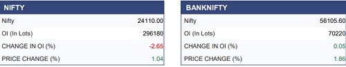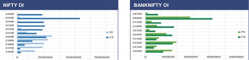 The Nifty index witnessed a sharp recovery from the 22,500 level during the past week, gaining nearly 6% and closing above the 24,000 mark. This reversal indicates a potential base formation for the near term. From a technical standpoint, the 50-week EMA is positioned in the 24600–24700 zone, which may act as an immediate hurdle and lead to some consolidation. However, a decisive breakout above this zone could pave the way for further upside towards the 25,200 level. On the derivatives front, significant call writing is aligned with the 25000 strikes, highlighting strong overhead resistance. Meanwhile, notable put writing at the 23,000 strike suggests that this level is likely to act as a key support in the near term.