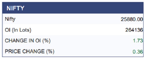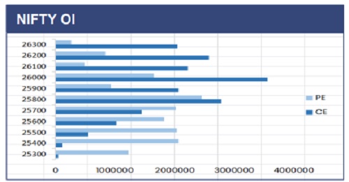 The Nifty 50 started the week on a volatile note, witnessing selling pressure in the early sessions that dragged the index down to an intraday low of 25,473. However, a recovery in the latter half, helped the index rebound and close in the green at 25,790. On the daily chart, the index continues to trade below its key 50-DEMA, indicating that upside pressure remains capped and the broader trend still cautious. In the derivatives segment, significant put writing at lower strikes along with short covering in call options reflects improving market sentiment. However, as long as the index remains below the crucial 26,000 mark, the upside may face resistance and profit booking could emerge at higher levels, keeping the index in a cautious zone.