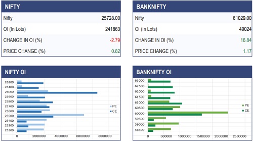The Nifty 50 witnessed a relief rally after last week’s sharp sell-off, advancing 0.83% to settle the day at 25,682. On the daily chart, the index reclaimed its key 50-DEMA, signalling an improvement in near-term sentiment. From a derivatives perspective, significant call writing has placed at the 25,700 and 25,800 strikes, which are likely to act as immediate resistance zone and may attract selling pressure if the index fails to decisively close above this zone. On the downside, significant put writing at the 25,500 strike indicates an immediate support zone.