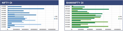 The Indian benchmark indices witnessed a range-bound yet positive session, with the Nifty 50 extending its gains for the fifth consecutive day, supported by favorable global cues. The index opened on a steady note and traded within a narrow band with a mild upward bias, eventually settling near the day’s high around the 24,350 mark. From a technical standpoint, the Nifty continues to inch higher, indicating a gradual continuation of the recovery phase, although momentum remains moderate. We maintain our constructive view, expecting the index to move towards the 24,600-24,800 zone, while immediate support is seen in the 23,900-24,100 range.