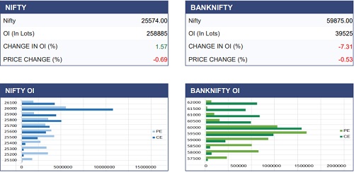The Nifty 50 continued to trade with a bearish bias after a gap-down opening. However, a reversal was seen in the second half near the 25,500 level, which lifted the index towards 25,600 before settling the day at 25,585. On the daily chart, the index closed below the 100-DEMA, indicating the possibility of further downside if the 25,500 level is breached. In the derivatives segment, fresh call OI buildup was observed at the 25,600 strike, while the significant call OI already positioned at the 25,800 and 26,000 levels, highlighting strong overhead resistance. On the downside, fresh put OI buildup at the 25,500 strike indicates immediate support.