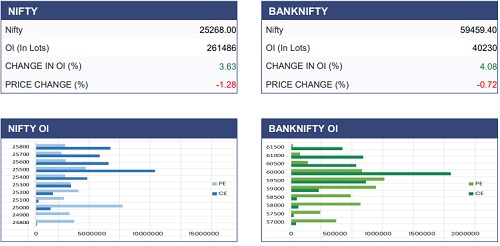 The Nifty 50 witnessed a sharp decline from the 25,600 level, dragging the index to an intraday low of 25,171 before settling at 25,232. In the derivatives segment for the January monthly expiry, fresh call writing was observed at the 25,500 strike, indicating an immediate upside hurdle. On the downside, major put OI has placed at the 25,000 level, suggesting near-term support where the index may either attempt a reversal or pause. On the daily chart, the rising trendline support is placed in the 25,100–25,200 zones, which may induce a relief rally towards the 25,450 level in the coming sessions, however “sell on rise” strategy remains advisable as long as the index stays below 25,500 marks.