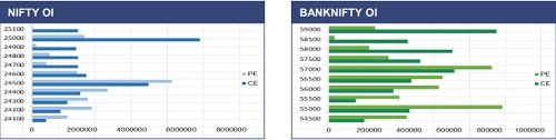 The Indian benchmark indices extended their gains for the third consecutive session, with the Nifty index settling above the 24,500 mark, up by 0.87%. On the derivatives front, OI data for the monthly expiry indicates fresh put writing at the 24,500 strike, reflecting improving market sentiment and strengthening support at lower levels. For the near term, index may continue its upward trajectory with a potential move towards the 24800 and then 25000 mark. However, on the upside these levels hold significant call writing, which could act as a key resistance zone and may trigger some consolidation near this crucial hurdle.