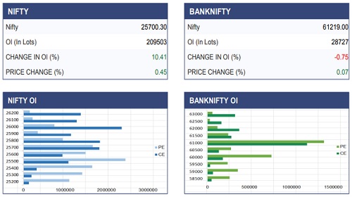 The Nifty extended its gains and settled at 25,713 with reclaiming its key 50-DEMA, indicating some improvement in market sentiment. On the derivatives front, the February series witnessed significant put writing at the 25,700 strike, forming a break or break area. While on the upside, major call OI buildup is visible at the 25,800 and 26,000 strikes, indicating a barrier zones. For now holding above 25,700 could pave the way for an upside move towards 25,800 and any decisive breakout above 25,800 may trigger short covering in call positions, potentially extending gains towards the 26,000 mark. However, failure to hold this critical zone may lead to fresh call writing, increasing the likelihood of the index retest its immediate support zone of 25,600–25,500.