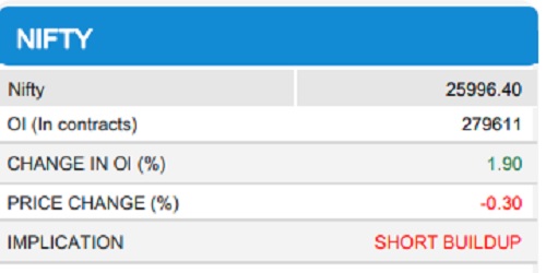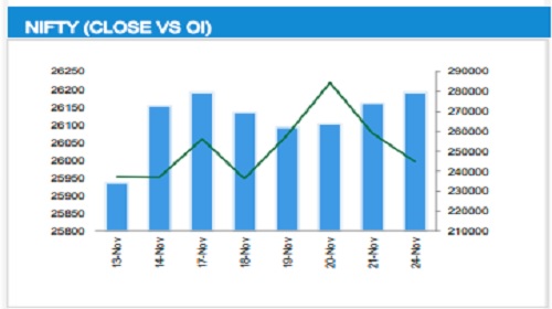 The Nifty 50 closed at 25,959, down 0.41% for the day as the index struggled to hold intraday recoveries. On the derivatives front, the 26,100 strike carries the highest Call OI, marking a strong supply zone and key upside barrier. Support has now shifted to 25,900, where notable Put OI addition indicates firm defence by market participants. With 26,050 acting as immediate resistance, the index is moving within a tight range, and a sustained move above this level may trigger short covering, while a breakdown below 25,900 could lead to further selling pressure and tilt momentum in favour of the bears.