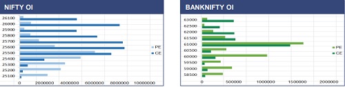 The Nifty index has start the March series on a positive note, advancing towards the 25,600-25,650 zone, which has aligned with the 50-DEMA. However, the index failed to sustain above this level as selling pressure emerged at higher levels, reinforcing a prevailing “sell-on-rise” sentiment. On the derivative front, fresh call writing has witnessed at the 25,600 and 25,700 strikes, indicating immediate resistance levels, while on the downside immediate support is placed at 25,300 and any decisive break below this level could extend the fall towards 25100-25000 zone