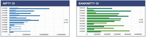 The Nifty index extended its losses for the third consecutive session, weighed down by rising crude oil prices, and settled the week with fall of nearly 2%. From a technical perspective, the index has slipped below the crucial 24000-23900 support zone, indicating a shift in market sentiment from bullish to cautious undertone. On the derivatives front, fresh call writing at the 24,000 strike, along with put unwinding, suggests that this level may now act as immediate resistance in the near term. Going ahead, the 23500-23600 zone is likely to provide a downside cushion, where the index may witness some consolidation before the next directional move.