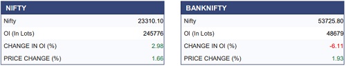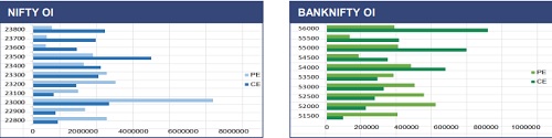 The Indian benchmark indices extended their gains, supported by fall in crude oil prices. The Nifty index opened the session with a gap-up above the 23,000 mark and inches higher towards the 23,400-23,500 zone. However, profit booking in the second half led the index to trim its gains and settle around the 23,300 level. On the derivatives front, fresh put writing at lower levels reflects improving market sentiment. Meanwhile, significant call writing remains intact at the 23,500 strike, indicating immediate resistance. A sustained move above this level could further extend the uptrend towards the 23,800-24,000 zones.