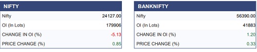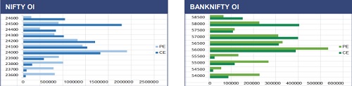 The Nifty index began the week on a positive note, reclaiming its short-term 20-DEMA, supported by strong recovery in heavyweight stocks such as Reliance and HDFC Bank. However, the 24200-24300 zones remain a crucial hurdle, and a sustained move above this range is necessary to re-establish a firm bullish bias. On the derivatives front, notable put writing is observed at the 24000 strike, indicating immediate support, while significant call writing at the 24500 strike suggests a strong resistance zone. This positioning points to a likely range-bound movement on the monthly expiry day, until there is any decisive breakout occurs on either side of this range.