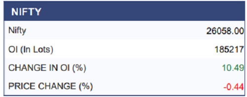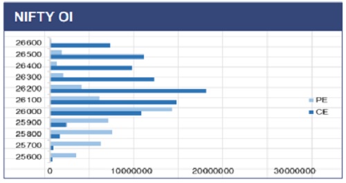 The Nifty 50 ended the week at 26,042, holding above its short term moving average of 20-DEMA, which is aligned near the 26,000 mark. On the daily chart, the index continued to trade within a narrow range of 26,000–26,200, reflecting a prolonged consolidation. In the derivatives segment, fresh call writing at the 26,100 strike indicates fragile market sentiment, as any decisive fall below 26,000 could lead to a retest of the 25,800–25,700 support zone. On the upside, heavy Call OI buildup at 26,200 continues to exert supply pressure, making it an immediate resistance area.