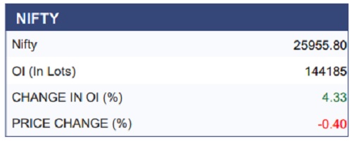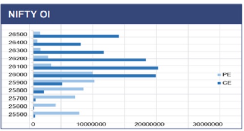 The Nifty 50 index closed at 25,942, slightly below the immediate support zone of 26,000–25,950, indicating mild bearish sentiment in the near term. The 25,800 level remains crucial, as a decisive break down below this mark could accelerate short-term correction. However, as long as the index holds above 25,800 on daily chart, the broader trend continues to maintain a positive bias. On the derivatives front, significant Call OI buildup at the 26,000 strike for the first weekly expiry of January signals a resistance zone, which previously acted as support. On the downside, 25,800 and 25,700 are acting as immediate support levels, backed by major Put OI at these strikes.