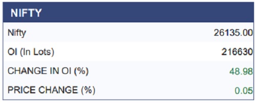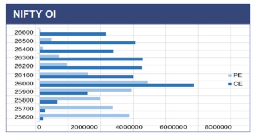 The Nifty 50 index ended the session at 25,938, witnessing a range bound movement of nearly 100 points on the monthly expiry of the December series. On the technical perspective Index continued to remain in a consolidation phase. Derivatives data of next weekly expiry, shows fresh OI buildup at the 26,000 Call strike, indicating immediate resistance level, while Put OI buildup at 25,900 level, suggesting immediate support. A decisive breakout on either side of this range will be crucial to determining the next directional move for the index.