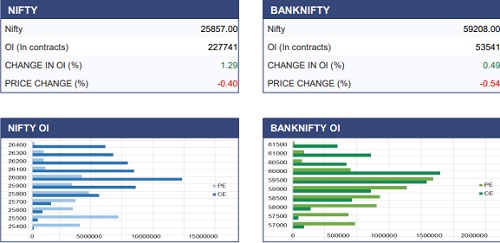 Nifty appears to have completed a 5-wave impulsive structure, and the recent breakdown from the rising trendline signals the start of a corrective phase. Price is struggling near the 26,000 zone while momentum is weakening, with RSI forming lower highs and slipping below its average, indicating further loss of strength. As long as Nifty trades below 26,050–26,100, the bias stays mildly negative. Immediate support sits near 25,550–25,500, and a breach there may extend the correction toward 25,250. Upside revival will emerge only on a decisive close above 26,100.