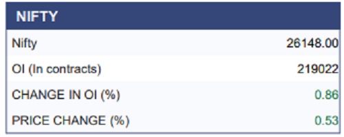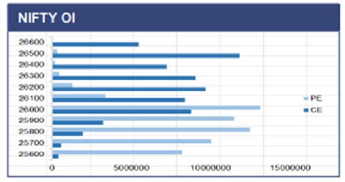 The Nifty 50 ended the week above the 26,000 mark after rebounding from the weekly low of 25,693, and ultimately delivered the subdued performance. Derivatives data shows fresh put writing at the 26,000 strike, indicating bullish bias, however the broader support zone stays firm between 25,800 and 25,700. On the upside, major Call OI buildup at the 26,100 and 26,200 strikes is expected to cap immediate gains. On technical front, the index retains a sideways to bullish structure, where a decisive breakout above 26,200 may open the path for the higher highs in the coming sessions.
