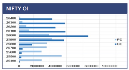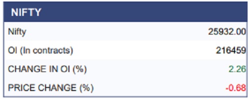 Nifty continues to trade in a narrow consolidation band, with price oscillating around the 25,850–25,900 zone after failing to sustain above the falling trendline. The index is holding above the key support near 25,700, but repeated rejections near 26,100–26,250 indicate strong overhead supply. The short-term trend remains sideways to mildly negative as long as Nifty stays below the trendline resistance. RSI is hovering below 50, reflecting weak momentum and lack of buying conviction. A decisive break below 25,700 could accelerate downside, while only a sustained move above 26,000 would improve sentiment meaningfully.