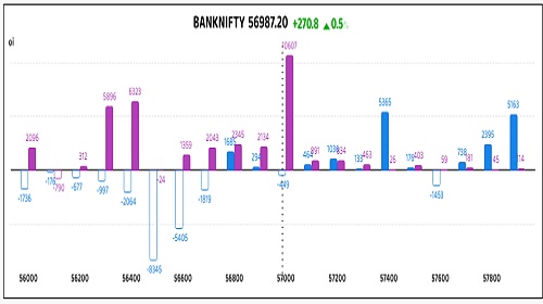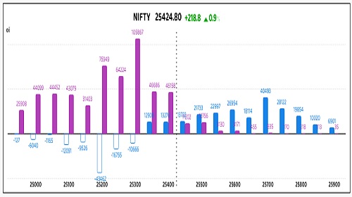 Nifty Futures and Bank Nifty Futures registered a decisive turnaround, posting substantial gains to halt a two-session losing streak. The indices opened with an upward bias and sustained moderate advances, underpinned by favourable global cues and a supportive lift from select index heavyweights. Domestic market sentiment received a significant boost from the IMF's revised projection, which upgraded India's FY22 GDP growth forecast, thereby reinforcing the nation's robust economic outlook. Furthermore, the initial indications of positive Q2FY26 earnings performance from certain large-cap entities likely bolstered confidence. Investor confidence was further bolstered by heightened expectations of an impending U.S. Federal Reserve (Fed) rate cut, while lower domestic retail CPI fueled optimism regarding a potential Reserve Bank of India (RBI) rate reduction in December. On the derivatives front, Nifty Futures closed 218.8 points higher, concurrent with an increase in Open Interest (OI) by 6.1 Lc shares (3.1% rise to 202.1 Lc shares), a setup indicative of a Long Build-Up. Similarly, Bank Nifty Futures advanced 270.8 points, with OI expanding by 0.47 Lc shares (2.5% increase to 19.5 Lc shares), also confirming a Long Build-Up. The Nifty futures premium expanded sharply from 61 points to 101 points, while the Bank Nifty premium saw a contraction from 220 points to 187 points. Market volatility, as measured by the India VIX, saw a sharp de-escalation, tanking 5.51% to 10.54. Concurrently, the Rupee (USD-INR) demonstrated considerable strength in the spot market, closing at Rs 88.08 against the US Dollar, marking its most significant single-day appreciation in nearly four months.