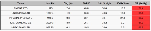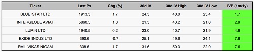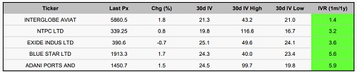 Cyient Ltd and UNO Minda have entered a heightened volatility phase in the derivatives market, underscored by elevated Implied Volatility Ranks of 71% and 69%, respectively. These lofty percentiles align with vigorous Expected Volatility metrics 41% for Cyient and 33% for UNO Minda signaling pronounced investor anticipation of near-term price swings. The surge in volatility has inflated option premiums, triggering a sharp rise in margin and capital requirements for both hedging and speculative deployments. Consequently, these contracts have become capital-intensive, diminishing their appeal for lean directional plays. Conversely, Interglobe Aviation and NTPC are navigating a subdued volatility regime, with Expected IVs of 21% and 19% respectively well below the broader F&O spectrum. This compression in implied risk has deflated option premiums, creating a cost-efficient landscape for directional strategies. Long Call and Long Put positions on these counters now offer a more favourable risk-reward profile, enabling traders to pursue speculative exposure with reduced upfront capital and enhanced payoff potential.