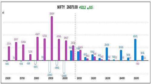 Nifty Futures and Bank Nifty Futures exhibited a resilient rebound from a weak start, ending with substantial gains and closing above the prior session high, with the primary catalyst being strong buying in IT stocks. This domestic strength was influenced by optimism surrounding a proposed India-US trade pact, which also saw institutional investors appear to redirecting funds toward emerging markets like India. While local sentiment was buoyant, global traders remained cautious ahead of the upcoming Nvidia earnings report and the US Fed's FOMC minutes, reflecting an overhang of uncertainty regarding technology sector valuation and the future trajectory of US monetary policy. Nifty Futures advanced 122.2 points, accompanied by a decrease in Open Interest (OI) by 5.64 lakh shares (a 2.8% reduction to 196.54 lakh shares), signaling Short Covering. Concurrently, Bank Nifty Futures rose 252.8 points, seeing an increase in Open Interest by 0.59 lakh shares (a 2.9% increase to 21.01 lakh shares), which indicates Long Build Up. Reflecting a reduction in near-term expectations, the Nifty Futures premium decreased to 18 points from 39 points, and the Bank Nifty Futures premium decreased from 75 to 11 points. Sectorally, IT, PSU Bank, and Healthcare shares advanced, while Realty, Oil & Gas, and Media shares declined. Market expectations of volatility, measured by the India VIX, eased, declining 1% to 11.97. Finally, the Rupee settled with a 2 paise gain at 88.58 against the US Dollar.