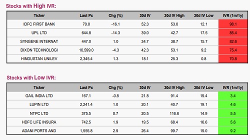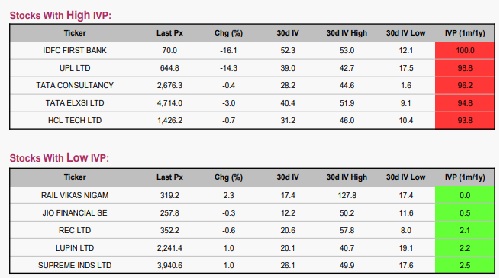 IDFC FIRST BANK and UPL LTD exhibit extreme premium expansion following double-digit price declines of 16.1% and 14.3%, respectively; with IDFC FIRST BANK hitting a 98.1 IVR and UPL LTD at 85.4, the implied volatility skew is heavily bid, creating an environment ripe for premium harvesting as wide-range sell-offs typically transition into volatility crush and price stabilization. Conversely, GAIL INDIA LTD and LUPIN LTD reside in a low-volatility vacuum with IVRs at bottommost levels in F&O segment; despite LUPIN LTD’s 1% gain, the suppressed 30d IV levels (21.8 and 20.1) indicate that the market has yet to price in significant tail risk, suggesting these stocks will remain tethered to their current consolidation zones until a catalyst triggers a volatility mean-reversion.