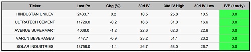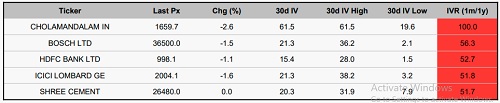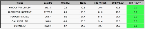 Cholamandalam Investment and HDFC Bank due to their exceptionally high Implied Volatility Ranks (IVR)—100% and 53%, respectively. This elevated IVR suggests that the market is overpricing future volatility, making their options contracts unusually expensive with their Realized Implied Volatility at 62% and 15%, the high IVR favors short premium strategies (selling options). This approach is designed to profit from the expected mean reversion of volatility and the subsequent decay of the inflated time premium. Conversely, long premium strategies (buying options) would be less profitable here. In sharp contrast, HindUnilever and UltraCemco Ltd are ideal candidates for long premium strategies (buying options). Their IVR levels are among the lowest in the Futures & Options (F&O) segment, indicating that their option contracts are relatively cheap. With modest realized volatilities (11% and 17%), the low-volatility environment is conducive to purchasing options.