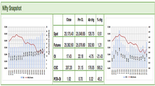 Indian markets closed on a positive note where buying was mainly seen in Metal, PSU & Private Banks, Oil & Gas and Information Technology. Nifty Feb Futures closed at 25,382.60 (up 302.80 points) at a premium of 207.20 pts to spot.