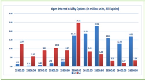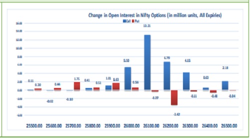 Highest OI build-up is seen at 26200 strike Calls and 26000 strike Puts, to the tune of 22.73mn and 24.61mn respectively.