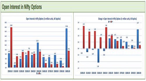 Highest OI build-up is seen at 26000 strike Calls and 25000 strike Puts, to the tune of 17.48mn and 17.87mn respectively.