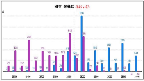 Nifty Futures ended marginally lower yesterday, as the absence of fresh domestic triggers and pre-holiday caution and limited aggressive positioning. Traders engaged in significant rollover and position squaring ahead of the final derivatives expiry of 2025, which restricted major directional bets and underscored a prevailing neutral-to-cautious bias. Volatility characterized the session amid the Nifty monthly derivatives expiry, while a technology-led selloff on Wall Street overnight pressured domestic IT exporters and heightened risk-off sentiment. Nifty January Futures fell 2.5 points as open interest increased by 45.3% to 151.07 lakh shares, indicating a strategic short build-up. Bank Nifty January Futures showed relative resilience, rising 243.8 points with an open interest increase of 32.0% to 12.47 lakh shares, signaling a localized long build-up. The Nifty futures premium expanded slightly to 180 points from 179 points, while the Bank Nifty premium rose to 415 points from 410 points, reflecting sustained cost-of-carry despite the flat underlying price action. Sectorally, Nifty Metal and Nifty Auto emerged as top gainers due to rising commodity realizations and robust IIP data, whereas Nifty IT and Nifty FMCG lagged following Nasdaq weakness and profit-booking in defensives, highlighting a clear shift toward cyclical outperformance. The India VIX closed at 9.68, a decrease of 0.44% after a prior 6.22% spike, suggesting that the recent correction is finding a technical base. The rupee rose 23 paise to close at 89.75 against the greenback, supported by the RBI’s proactive liquidity management and dollar swaps, which mitigated year-end currency volatility and provided a stable macroeconomic backdrop for equity markets.