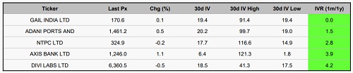 DIXON TECHNOLOGIES closed at 11,767.00 (-0.8%) with a 30d IV of 42.1 and a high IVR of 74.9. This elevated IVR favors a delta-neutral stance to capture premium decay, as price action is expected to transition into a moderate range-bound phase. HINDUSTAN UNILEVER settled at 2,290.20 (-0.1%) with 30d IV at 16.9 and an IVR of 64.2. Current moderate-to-high IVR levels suggest a buying advantage for anticipatory pricing, signaling an expected shift from narrow consolidation toward a wider price range expansion. GAIL INDIA LTD ended at 170.6 (+0.1%) with a 30d IV of 19.4. These bottom-percentile volatility levels dictate a wait-and-watch stance, with the expectation that the stock will maintain its current narrow sideways consolidation. ADANI PORTS finished at 1,461.20 (+0.5%) with 30d IV at 20.2. Given the negligible volatility relative to its yearly range in both the stocks, the mathematical edge remains flat, warranting a wait-and-watch approach during this continued period of sideways price action.