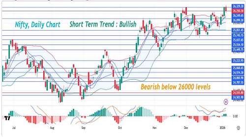 On Monday, the Nifty opened flat but slipped below the 26,300 mark by the close. The index initially attempted to hold above 26,300 but later faced selling pressure, led by IT and Financial stocks, as heavyweight names such as Infosys, HDFC Bank, and Reliance Industries declined. On the positive side, FMCG stocks ended mostly higher following Q3 business updates, with Nestle India gaining around 3%. Auto stocks remained strong after December sales data, with Eicher Motors and Maruti Suzuki hitting record highs. Sectorally, Realty and Defence emerged as top gainers, while IT and Oil & Gas stocks underperformed, dragging the index lower. The Nifty dropped 78.25 points closing at 26,250.30. The Nifty formed a bearish candlestick pattern on the daily chart, but we expect the buying momentum to continue for the day. The volatility index IndiaVIX has closed below 12 and we expect the volatility to remain low in the short term. The Nifty short-term trend remains bullish and the trend will turn bearish only below 26,000 levels. The 9-day simple moving average is placed at 26,122.