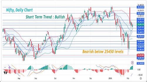 On Friday, the Nifty opened gap-down but rebounded strongly to reclaim the 25,600 level. The index faced rejection twice at the 50-day EMA, each time finding support at the 20-day EMA, and eventually closed decisively above the 50-day EMA in the final hour, signalling bullish momentum on RBI policy day. FMCG supported the index, led by a 5% surge in ITC on proposed cigar price hikes and block deals, while IT stocks lagged amid AI concerns and weakness in TCS and Tech Mahindra. IndiaVIX fell 20% for the week, signalling cooling volatility. Despite volatility during the Union Budget week, the Nifty gained 3.5% for the week. RBI MPC unanimously held the repo rate at 5.25%, the third pause in four meetings after 100 bps cuts in Feb–Jun 2025 and a 25 bps cut in December 2025. Market sentiment to be driven by the fine print of the India-US trade pact. The Nifty gained 50.90 points closing at 25,693.70. The Nifty formed a bullish candlestick pattern on the daily chart, and we expect the buying interest to continue for the day. The volatility index IndiaVIX has closed below 12 and we expect the volatility to ease in the short term. The Nifty short-term trend remains bullish and the trend will turn bearish only below 25,450 levels. The 9-day simple moving average is placed at 25,426.