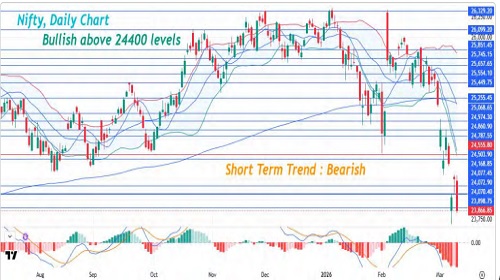 On Wednesday, the Nifty opened negative and slipped below the psychological 24,000 mark for the first time since April 17, 2025. Selling pressure persisted throughout the day as India VIX surged 11% after falling 19% yesterday. Except for Pharma and Energy, all sectoral indices closed in the red, with Auto and Financials leading the decline, falling nearly 3%. Only 9 Nifty stocks ended in the green. Bajaj Finance was the top loser amid concerns over potential leadership transitions due to new RBI rules. The Nifty plunged 394.75 points closing at 23,866.85. The Nifty formed a bearish candlestick pattern on the daily chart, and we expect the selling pressure to continue for the day. The volatility index IndiaVIX has closed above 18 and we expect the volatility to increase in the short term. The Nifty short-term trend remains bearish and the trend will turn bullish only above 24,400 levels. The 9-day simple moving average is placed at 24,599.