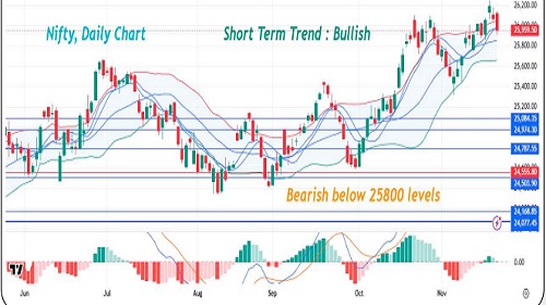 On Monday, Nifty opened on a positive note but slipped below the 26,000 mark, turning weak ahead of the monthly expiry. IT and banking stocks supported the index during the first half, but a sharp decline emerged towards the close. The MSCI rejig triggered significant last-hour volatility, with nearly 38 Nifty stocks ending in the red. JSW Steel, BEL and Max Healthcare were among the top losers, while autos particularly twowheelers continued to see strong buying interest as Eicher Motors and Bajaj Auto emerged as the top gainers. Market sentiment was also weighed down by concerns over the government’s new labour codes, which are expected to increase costs for companies. The Nifty dropped 108.65 points closing at 25,959.50. The Nifty formed a bearish candlestick pattern on the daily chart, but we expect the buying interest to emerge at lower levels. The volatility index IndiaVIX has closed above 13 and we expect the volatility to remain high in the short term. The Nifty short-term trend remains bullish and the trend will turn bearish only below 25,800 levels. The 9-day simple moving average is placed at 25,984.55.