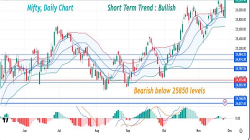 * Based on Open Interest in Options, FII's were net bullish by 180479 contracts. In Nifty, the highest PUT OI was seen at 26000 and the highest CALL Open Interest was seen at 26300 strike.