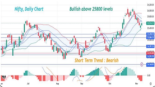 On Monday, the Nifty opened on a positive note and closed above the 25,500 mark. The index was bullish during the first half, testing an intraday high of 25,650, where it encountered resistance and subsequently came under pressure in the latter half, losing nearly 70 points from the day’s high. The Nifty snapped its three-day losing streak, supported by gains in IT stocks, with Infosys and HCL Tech emerging as the top gainers. However, Trent was the top loser, slipping 7% after posting muted Q2 results. Except for Realty, FMCG, and PSU Bank indices, all other sectoral indices ended in the green. The Nifty gained 82.05 points closing at 25,574.35. The Nifty has formed a bullish candlestick pattern on the daily chart but we expect the selling pressure to continue for the day. The volatility index IndiaVIX has closed above 12 and we expect the volatility to increase in the short term. The Nifty short-term trend remains bearish and the trend will turn bullish only above 25,800 levels. The 9-day simple moving average is placed at 25,725.3..