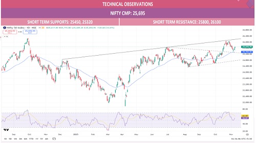 The Nifty index opened on a positive note, after early volatility witnessed buying interest and eventually settled the day on a positive note at 25,695. Technically, on the daily chart, Nifty formed a bullish candle with long lower shadow, indicating buying interest at lower levels. Short term support for the index is placed near 25,450, followed by 25,350, where 50-DEMA is placed. On the upside, 26,100 will serve as the major resistance for the index. Therefore, traders are advised to adopt a buy on dips strategy.