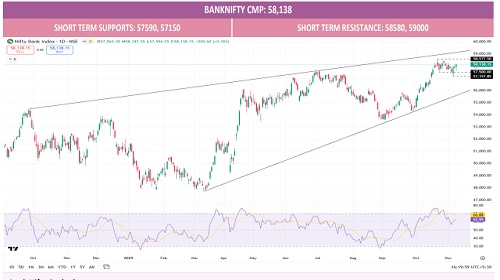 The Bank Nifty index opened on a flat to positive note, witnessed both side volatility but thereafter index resume buying interest, and settled the day on a positive note at 58,138. Technically, on the daily chart, the Bank Nifty index has formed a bullish candle with long lower shadow, indicating strong demand at lower levels. Immediate support for the Bank Nifty is placed near 57,590 levels. As long as the Bank Nifty index holds above 57,590 levels, traders are advised to adopt a buy-on-dips strategy. On the upside, 58,580 and 59,000 will act as resistance points for the index.
